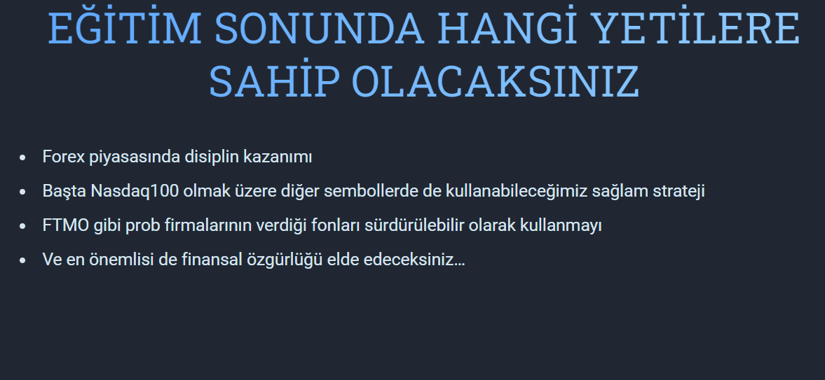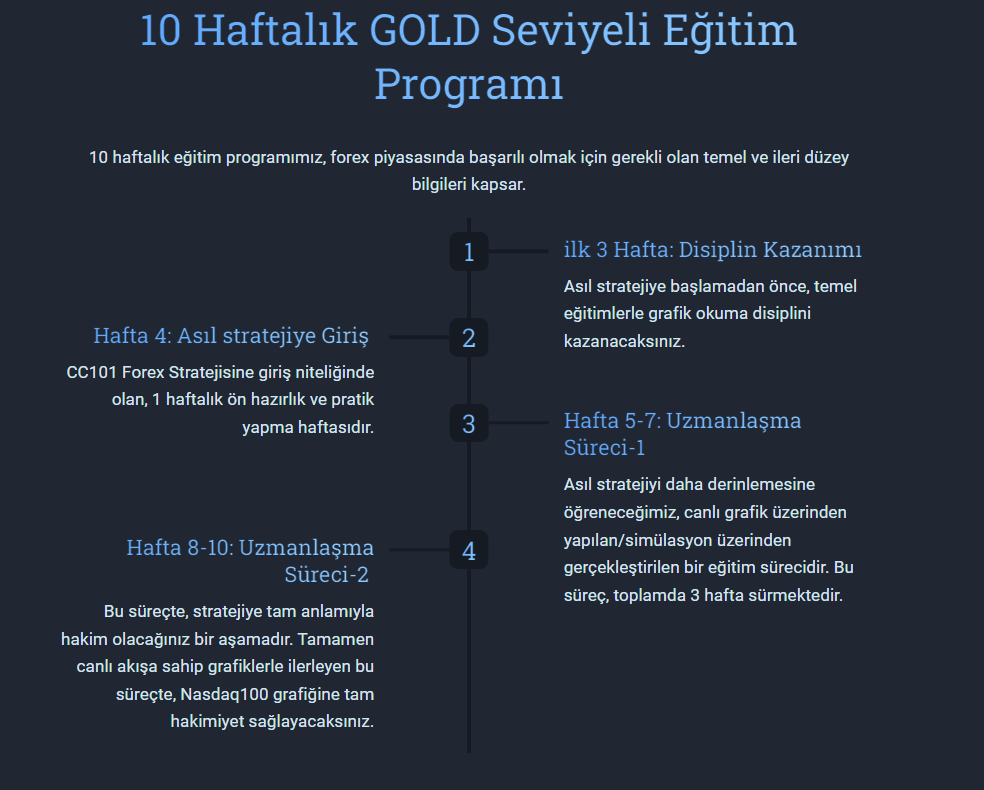 Bu durumdan dolayıdır ki , özgün eğitim modelimiz de ise size grafiği yorumlamayı buna bağlı olarak fiyatın hangi yöne gideceğini, NASDAQ 100 de uzmanlaşmayı , disiplin ve zihin kontrolü gibi çok önemli bilgiler verecektir.